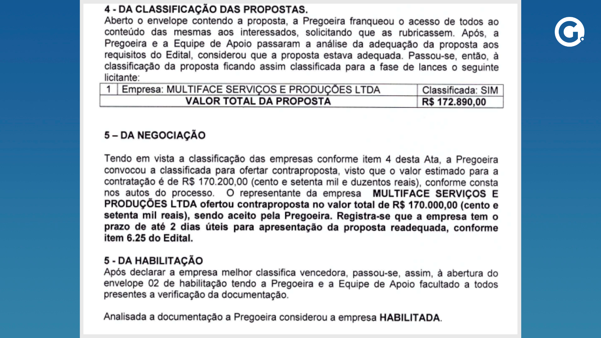 Um outro documento obtido pela reportagem mostra o resultado da licitação. De três empresas credenciadas, apenas uma compareceu no momento do pregão presencial, a Multiface Serviços e Produções LTDA. A empresa pertence a Caio Faria Donatelli, preso nesta semana suspeito de participar do esquema criminoso que desviava recursos públicos da Prefeitura de São Mateus. >