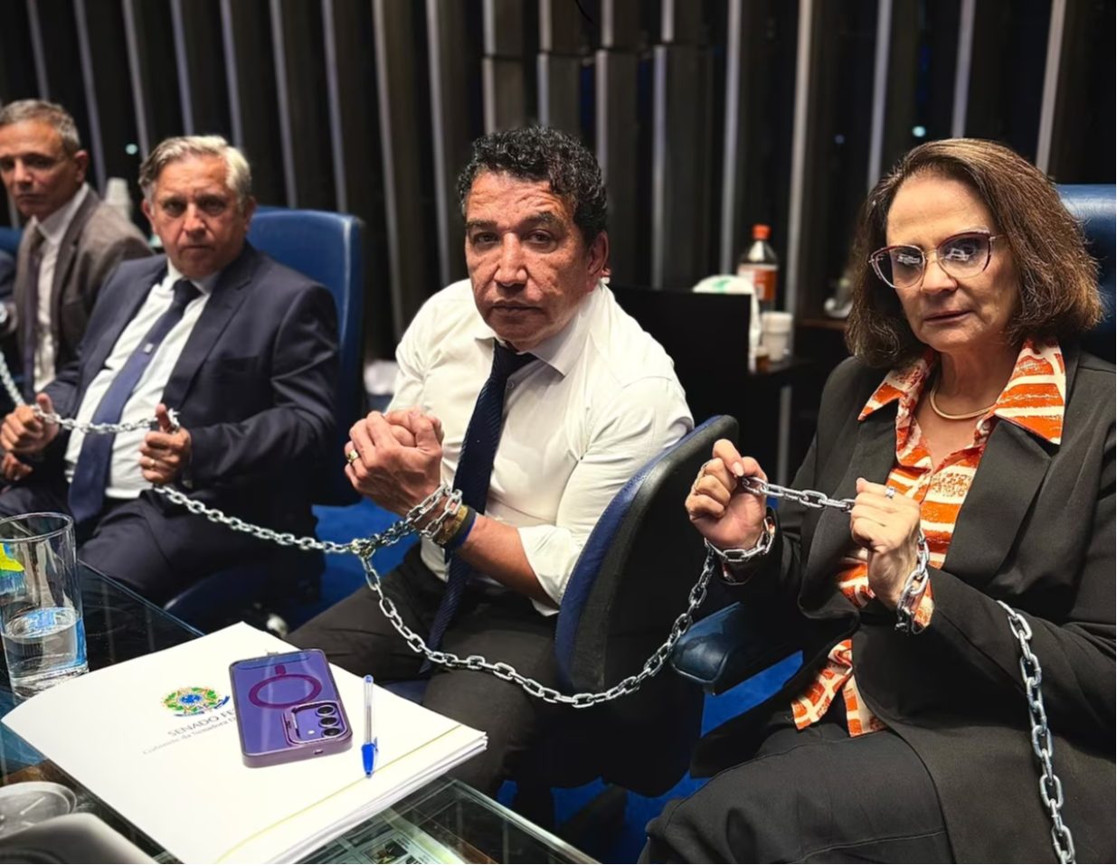 Os senadores aliados do ex-presidente Jair Bolsonaro (PL) ocuparam a Mesa Diretora da Casa desde terça-feira (5). Magno Malta (PL-ES), Izalci Lucas(PL-DF) e Damares Alves (Republicanos-DF) se acorrentaram à Mesa utilizada para comandar as reuniões.>
