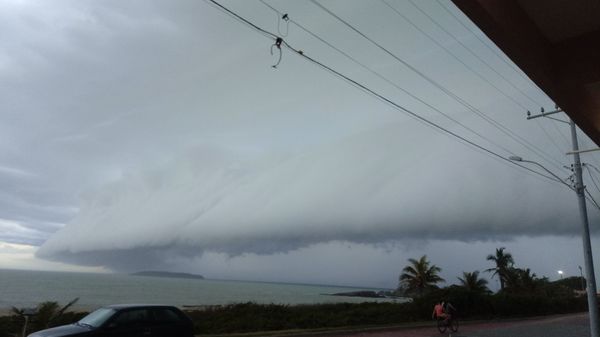 O Danilo Araújo foi um dos que filmaram a nuvem em Marataízes e disse que a velocidade da chuva estava impressionante. Em Piúma, o Deidson Ribeiro contou que até deu praia pela manhã, mas, à tarde, a nuvem espantou os banhistas.>
