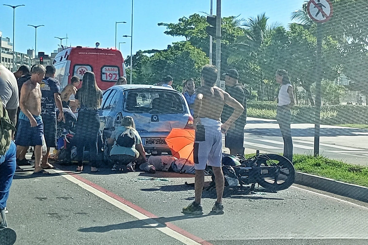 Com o impacto da batida, uma passageira que estava na garupa da moto foi arremessada e foi parar debaixo de um carro. Ela e o motociclista de aplicativo receberam atendimento de uma equipe do Serviço de Atendimento Móvel de Urgência (Samu/192).>