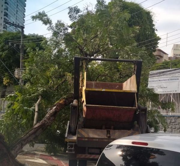 A queda de uma árvore na região da Praça do Cauê, no bairro Santa Helena, em Vitória, deixou o trânsito complicado para quem sai da Terceira Ponte e segue em direção à Reta da Penha, na tarde desta quarta-feira (10). O acidente aconteceu após um caminhão carregado com entulho fazer uma curva e esbarrar na árvore.>