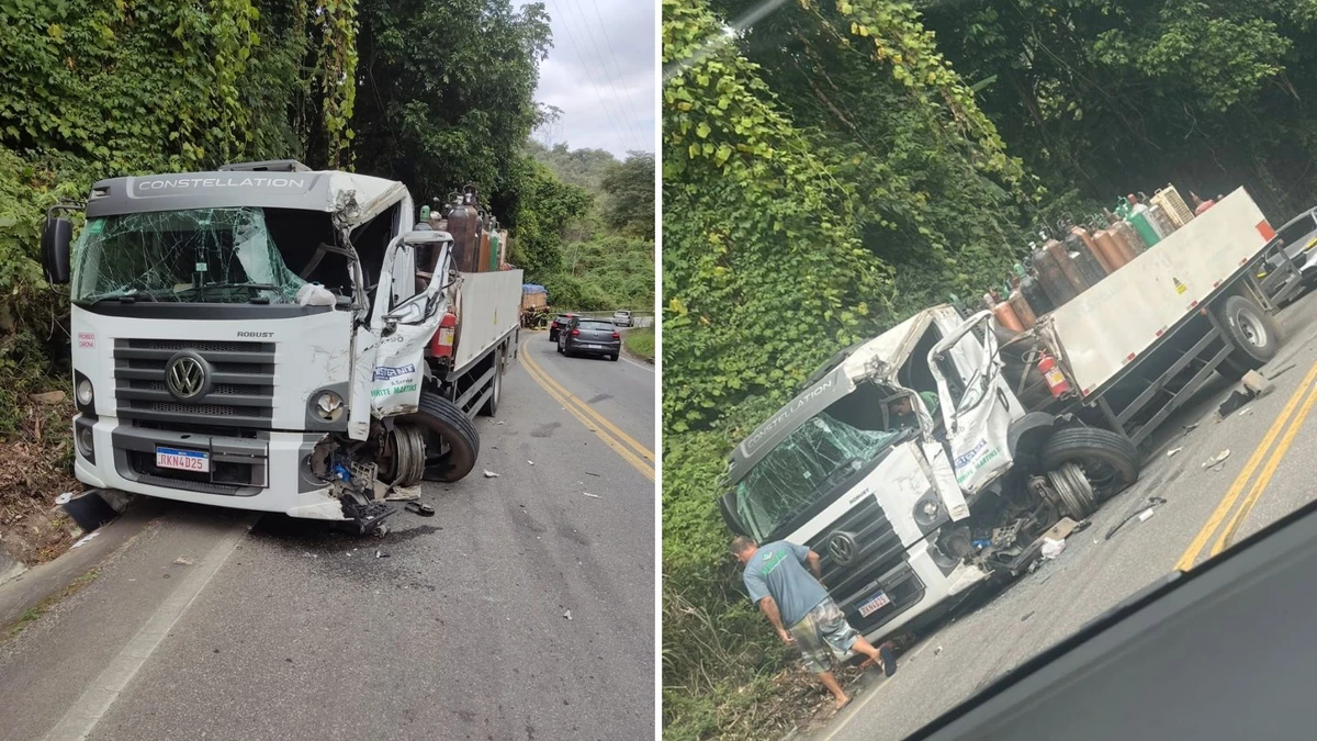 Um caminhão e uma carreta bateram na manhã desta quarta-feira (6) na ES 164, na localidade de Jaciguá, em Vargem Alta, região Sul do Espírito Santo. Testemunhas contaram ao Corpo de Bombeiros que um caminhão tentou desviar de outro que estava parado na pista por problemas mecânicos. Em seguida, o veículo que fazia a ultrapassagem e uma carreta que vinha no sentido contrário bateram. >