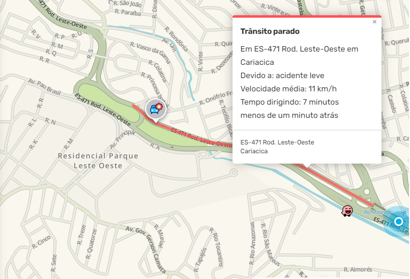 O aplicativo Waze, que mostra o trânsito em tempo real, aponta que o trânsito na via é complicado e os motoristas têm trafegado no local com a velocidade média de 11 quilômetros por hora. >