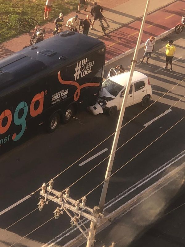 O ônibus pertence a uma empresa de internet, a Loga. Em nota, ela informou que o veículo estava estacionado na Orla de Itaparica quando foi atingido pelo carro. Representantes estiveram no local e o coletivo será encaminhado à uma oficina para reparos.>