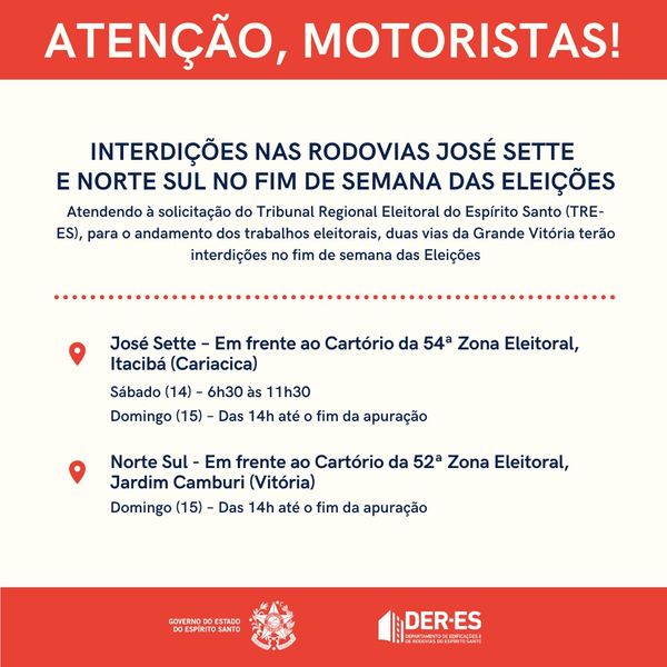 Segundo o DER-ES, as interdições serão úteis ao andamento dos trabalhos eleitorais. A reportagem de A Gazeta procurou as prefeituras de Vitória, Serra, Cariacica e Vila Velha, os quatro maiores colégios eleitorais do Espírito Santo, para saber sobre possíveis alterações no trânsito de veículos nos municípios.>