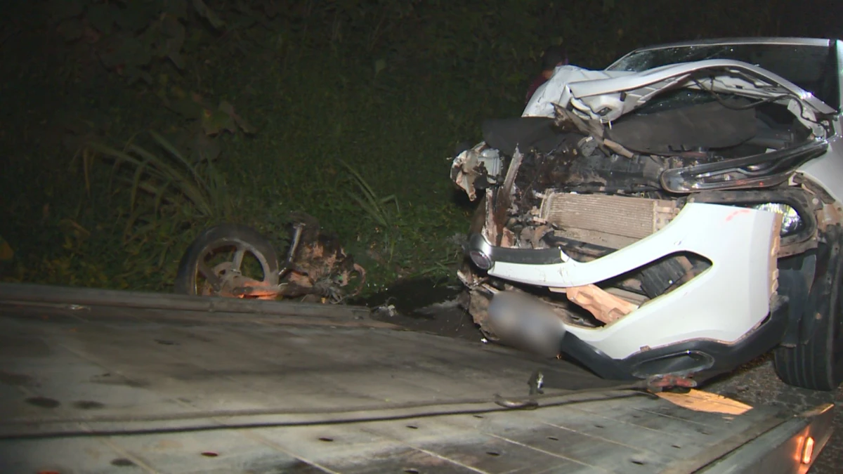 Com o impacto, a motocicleta ficou completamente destruída, e o guidão chegou a se soltar, sendo arremessado a metros de distância. A frente da caminhonete também ficou danificada>