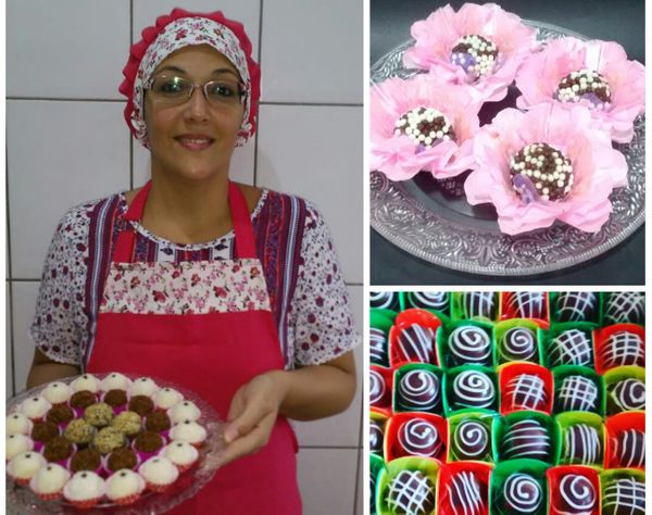 Ela fabrica doces diversos para festas de aniversário e casamento, como brigadeiros tradicionais, de churros e gourmet, beijinhos, ouriços de café, bombons, cupcakes, entre outros.>