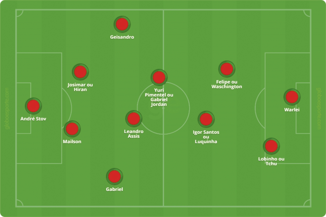 Os remanescentes do Estadual Igor Santos e Waschington também buscam espaço. E os reforços Gabriel Jordan e Hiran mostraram serviço durante os treinos, e também podem ser surpresas na escalação, que deve ser: André Stov, Gabriel, Josimar ou Hiran, Mailson e Geisandro; Leandro Assis, Yuri Pimentel ou Gabriel Jordan, Igor Santos ou Luquinha, Felipe ou Waschington; Warlei e Lobinho ou Tchu.>