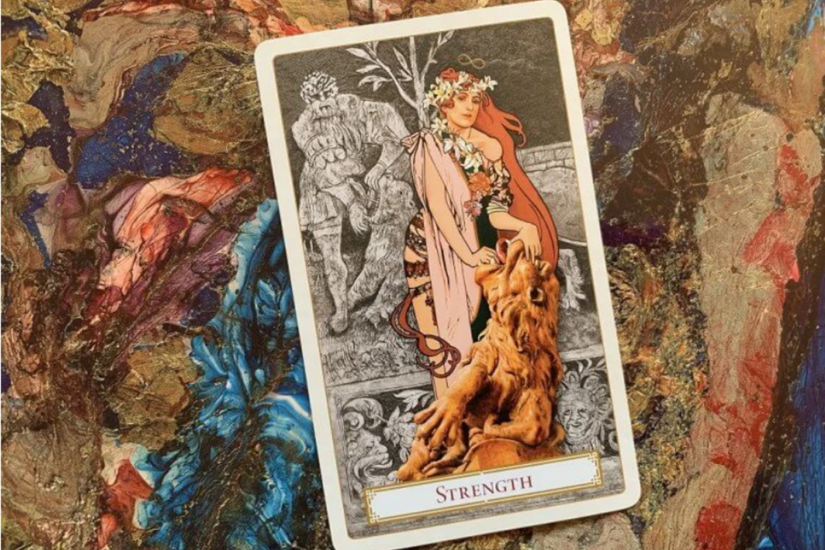 A Força, representada por uma mulher abrindo a boca de um leão, simboliza a combinação entre coragem, autocontrole e sabedoria para superar os obstáculos da vida.>
