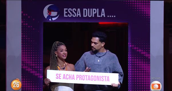 Eles tinham que decidir qual das duplas "é espaçosa", "não faz questão de se conectar", "se acha protagonista", "não tem entrosamento", "esconde o jogo" ou "faz média com todo mundo". Os participantes poderiam escolher qualquer participante, mas apenas os protagonistas tinham direito a réplicas.>