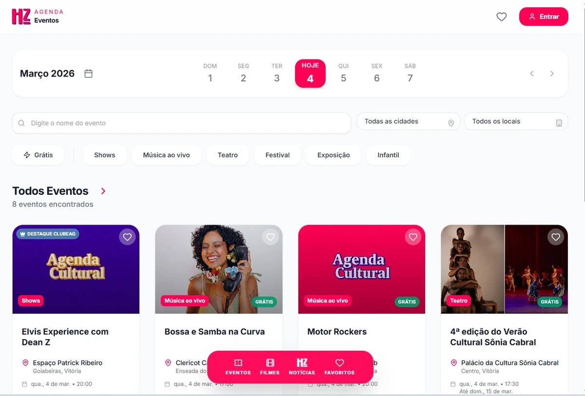 A nova versão também permite favoritar eventos, compartilhar programações e adicionar o atalho da página à tela inicial do celular. O acesso é gratuito. Acesse agendahz.agazeta.com.br e descubra tudo o que está acontecendo no Espírito Santo, do palco ao cinema, sem perder nada.>