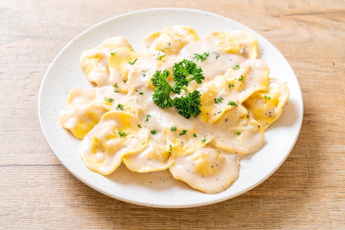 Em uma panela, coloque a água e leve ao fogo médio. Quando começar a ferver, acrescente o sal e a massa de ravioli. Cozinhe até a massa ficar al dente . Em seguida, escorra e transfira a massa para uma travessa. Coloque a manteiga derretida e a salsa e misture delicadamente. Reserve. >