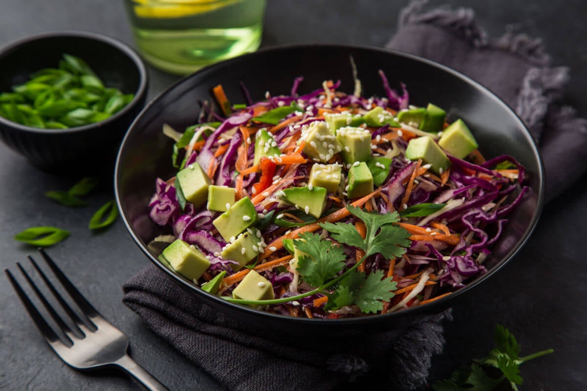 Corte o repolho em fatias finas, rale a cenoura e corte o abacate em pedaços pequenos. Em um recipiente, coloque o repolho, a cenoura e o abacate por cima. Tempere a salada com azeite, suco de limão, sal e pimenta-do-reino. Para finalizar, salpique o gergelim branco e acrescente o coentro. Sirva em seguida. >
