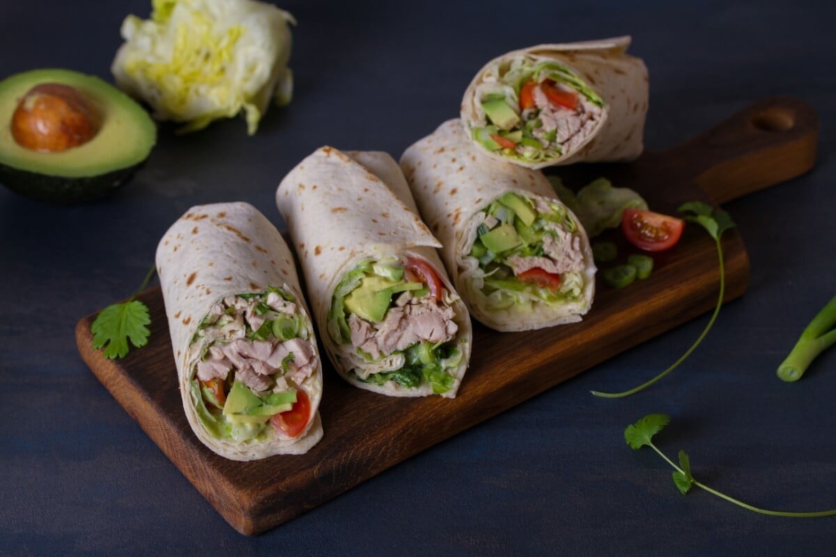 Em uma tigela, misture o frango desfiado com o suco de limão, o azeite, a salsinha, o sal e a pimenta-do-reino. Reserve. Amasse levemente parte do abacate para formar uma pastinha rústica e deixe algumas fatias para montar o recheio. Abra a tortilha integral e espalhe uma camada fina do abacate amassado. Acrescente o frango temperado, as fatias de abacate, a alface, o tomate-cereja e a cebola-roxa. Enrole firmemente como um rocambole e corte ao meio. Sirva em seguida. >