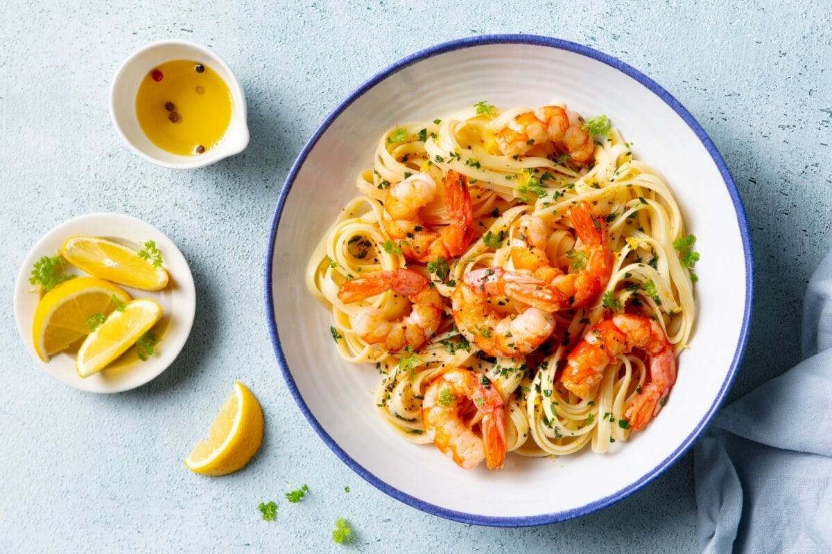 Em uma panela em fogo médio, cozinhe o macarrão em água com sal até ficar al dente . Reserve uma concha da água do cozimento, escorra e mantenha o macarrão quente. Em um recipiente, tempere os camarões com sal, pimenta-do-reino e metade das raspas de limão. Aqueça uma frigideira grande em fogo médio-alto, adicione metade do azeite e grelhe os camarões por cerca de 2 minutos de cada lado, até ficarem rosados. Retire e reserve. >