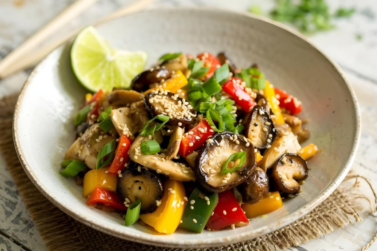 Em uma frigideira grande, aqueça o azeite em fogo médio. Acrescente o alho e o gengibre e refogue rapidamente, sem deixar escurecer. Junte os cogumelos e refogue até que comecem a dourar. Adicione os pimentões e refogue por mais 3 minutos, mantendo os legumes levemente crocantes. Tempere com o óleo de gergelim, o sal e a pimenta-do-reino, misturando bem para envolver todos os ingredientes. Finalize com o suco de limão e o gergelim, mexendo delicadamente. Desligue o fogo e acrescente a cebolinha por cima. Sirva em seguida. >