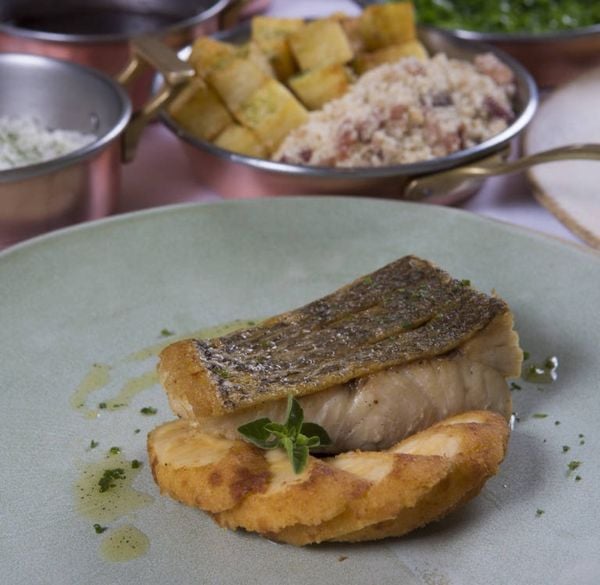 Batizado de almoço brasileirinho, o pê-efe tem como entrada uma salada verde e pão de mandioca. De prato principal, escolhe-se entre o peixe do dia, frango ou escalope de filé mignon, que vêm acompanhados de arroz branco, feijão roxinho, feijão preto, batata sautée, couve refogada com bacon, banana à milanesa e farofa.>