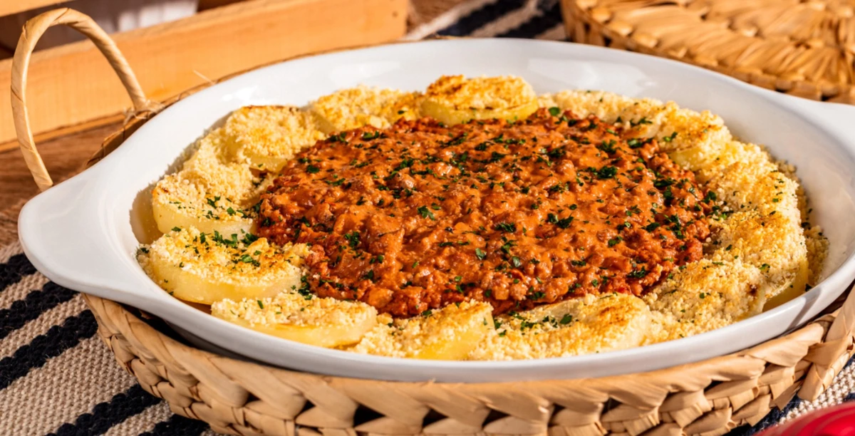 É isso que acontece na receita abaixo, escolhida por nossa equipe para a sua refeição de fim de semana: carne moída cremosa, com um toque de creme de leite, acompanhada por batatas finalizadas com queijo parmesão ralado. Deu água na boca? Então acompanhe as instruções passo a passo. >