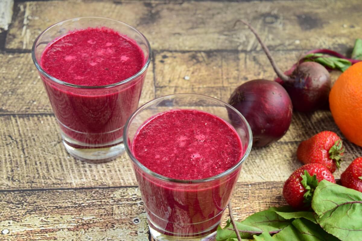 No liquidificador, coloque os morangos, a beterraba , as cenouras, as laranjas e a água e bata até obter uma consistência homogênea. Em seguida, coe o suco, transfira para um copo e sirva em seguida. >