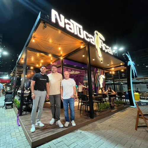 Wanderson Lamoia, presidente do Grupo Lamoia, acaba de lançar uma rede de açaiterias, a Natuca. A nova unidade de negócios chega para consolidar a presença do grupo capixaba também no mercado do açaí, um produto que já faz parte da cultura alimentar e social dos brasileiros. O Grupo Lamoia é uma das principais indústrias de sorvete do Brasil e lidera as marcas Paletitas, Luigi, Real Gelato, Açaí Natuzon e iCream. A primeira loja da Natuca foi inaugurada no Itapuã Grand Park, na última sexta, no novo point gastronômico em Vila Velha, e tem projeto assinado pelo arquiteto Vitor Cipriano. Na foto, Vitor Lamoia, Wanderson Lamoia e Vitor Cipriano.