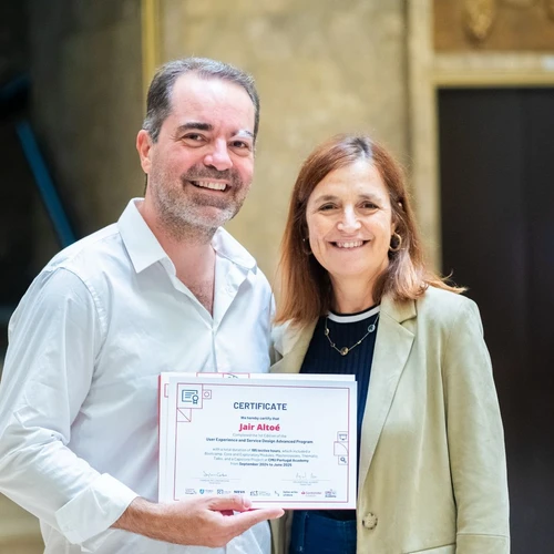 Jair Altoé recebe, das mãos de Inês Rocha de Gouveia, presidente da Fundação Santander Portugal, o certificado de conclusão da pós-graduação em User Experience and Service Design, promovida pela CMU Portugal Academy. Capixaba radicado em Lisboa, Jair foi um dos 10 selecionados para a bolsa de estudos do programa Santander Open Academy em Portugal. A formação é fruto de uma parceria entre a Carnegie Mellon University (EUA) e instituições portuguesas como o Instituto Superior Técnico, a Universidade NOVA de Lisboa, a Faculdade de Belas-Artes e a Universidade de Lisboa. Com mais de 20 anos de experiência como designer gráfico e digital, ele celebra agora uma nova fase da carreira, voltada para o design de interação e experiência do usuário.