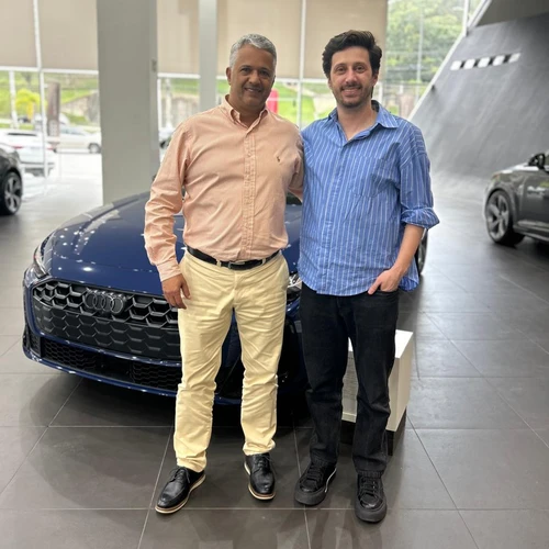O gerente da Audi Center Vitória, Fábio Lopes, e o CEO do Grupo Morena Rosa, Lucas Franzato: desfiles e apresentações sobre a nova coleção da marca. Esse evento acontece periodicamente e é a primeira vez foi realizado numa concessionária de automóveis.