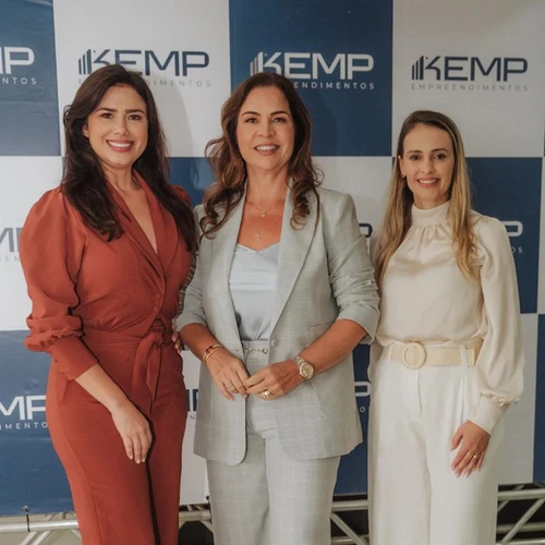 A diretora da Kemp Empreendimentos Rubia Zanelato entre as colaboradoras da empresa: a gestora de engenharia, Alessandra Castro e a gerente comercial Ellen Cordeiro no evento de entrega do empreendimento Ilhas de Kiribati, na Praia de Itaparica.