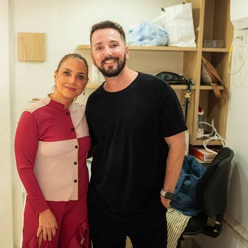 O CEO da WB Produções Wesley Telles com a atriz Heloísa Périssé na apresentação do espetáculo “Avesso do Avesso”, em que ela contracena com o ator Marcelo Serrado, no Teatro Universitário da Ufes, em Vitória, pelo Circuito Cultural Unimed Vitória.