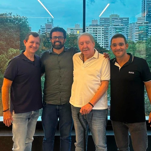 Lula Finamore, na comemoração de seu aniversário de 81 anos, junto ao filho Felipe Finamore Simoni e aos demais sócios do escritório Finamore Simoni Advogados, Bruno Finamore Simoni e Thiago Rezende.