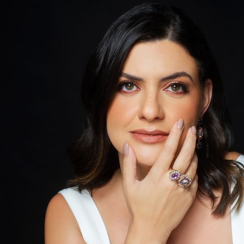 Em clique de Jackie Campos, Joana Barbosa posa com um dos queridinhos de sua primeira coleção de joias 100% autoral para a Elow, intitulada Vida. O anel em ouro amarelo, topázio sky, peridoto e ametista desenhado pela empresária é fortemente inspirado no estilo clássico e exala afetividade e memória.