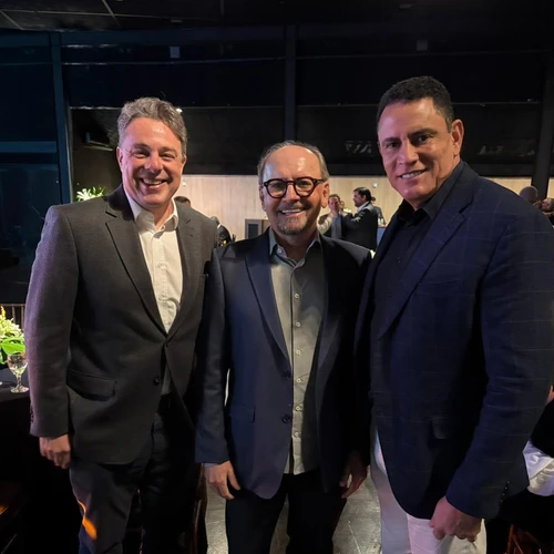 Marcus Magalhães ao lado do presidente da Fecomércio, Idalberto Moro, e do deputado federal Da Vitória, durante evento em que a Imetame e a Hapag-Lloyd apresentaram ao mercado o projeto do Porto de Aracruz, com previsão de início das operações em meados de 2026.