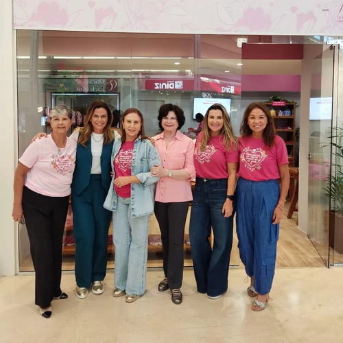 Em homenagem ao Outubro Rosa, a loja da Afecc está a todo vapor no segundo piso do Shopping Vitória. Teresa Bedran e Mary Helal integram o time de madrinhas que vestem a camisa da prevenção contra o câncer de mama. Na foto, Lea Penedo e Mariana Buaiz - diretora e vice-presidente da Afecc - com Mary Helal, Teresa Bedran, Renata Pimentel e Ana Clark, que também fazem parte da equipe diretora da Associação.