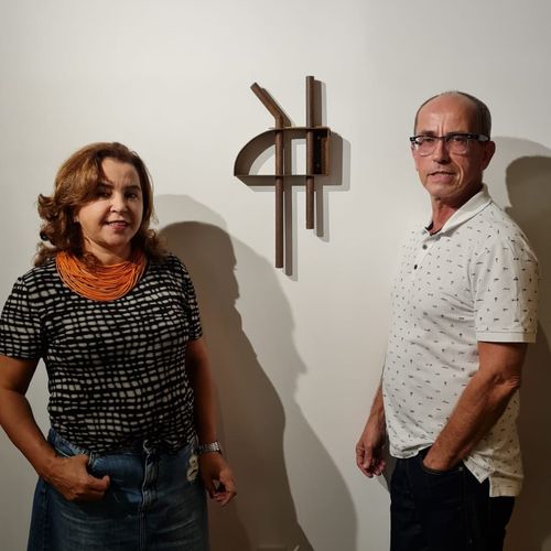 Aurea Lígia Bernardi e Léo Bahia com a obra do artista capixaba Natan Dias, que faz parte da mostra "Negras Falas", em cartaz na Léo Bahia Arte Contemporânea, no Centro de Vitória