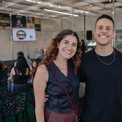 O barista Caio Lucena, ganhador do Campeonato Brasileiro de Aeropress 2025, foi um dos convidados a palestrar no Festival Coffees. Na foto, Caio está com Natalia Camoleze, jornalista e criadora de conteúdo do universo do café, que apresentou os 3 dias de evento no Shopping Vitória.