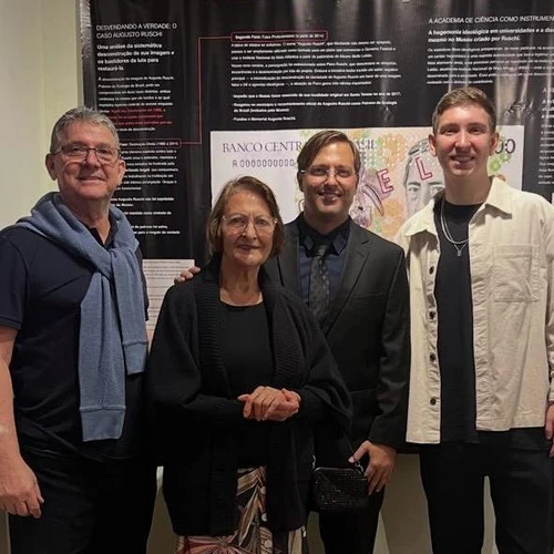 Piero, Marilande, Enrico e Fábio Ruschi; na inauguração do Memorial Augusto Ruschi, em Santa Teresa. O espaço conta a história do biólogo, por meio de pesquisas do seu filho Piero Angeli Ruschi.