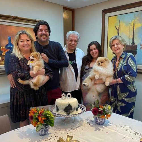 Maurício Prates celebrou 80 anos, com a nora Maria Cecília, o filho Gustavo, a neta Clara e a esposa Carmen, com jantar em família.