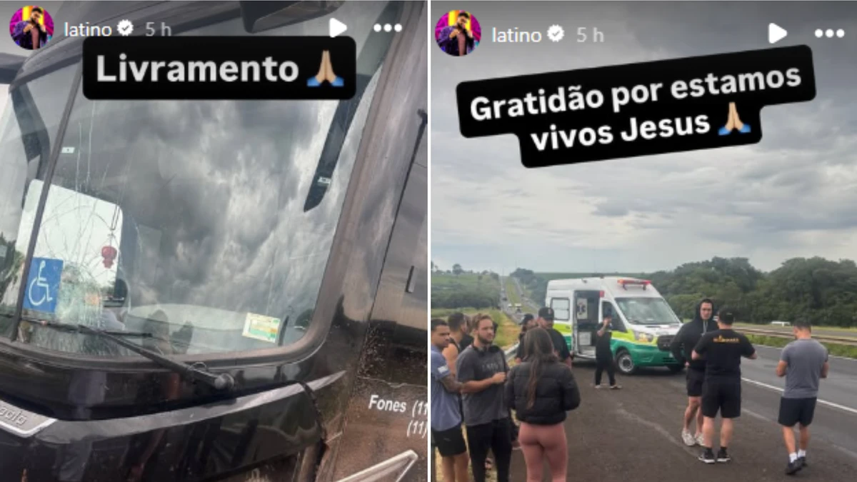 O próprio Latino comentou o episódio nas redes sociais e compartilhou imagens do veículo após o acidente. Em tom de alívio, o artista agradeceu pelo desfecho da situação. "Sou grato pelo livramento e por estarmos todos vivos", escreveu.>