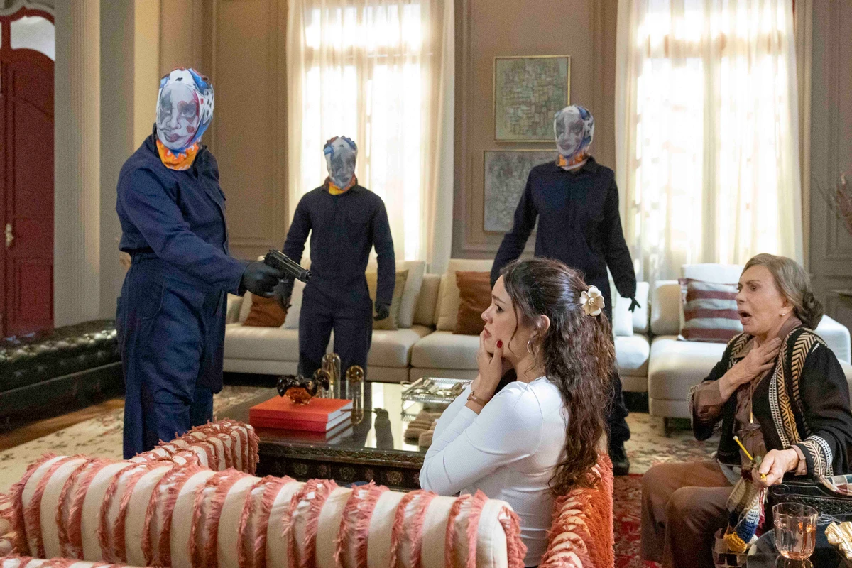 Na cena, o grupo de assaltantes aterroriza a família de Arminda (Grazi Massafera) e leva embora as estátuas e todo o dinheiro da vilã. Em seguida, a quadrilha decide raptar Josefa (Arlete Salles) para ganhar tempo para a fuga. Gerluce (Sophie Charlotte) pede para ser levada junto com a patroa.>