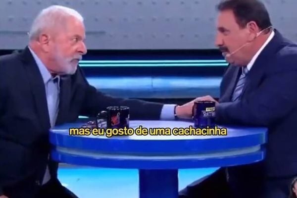 "Presi... é, é, Lula", disse Ratinho cometendo uma gafe. "Mas eu gosto de uma cachacinha", comentou o ex-presidente em outro trecho.>