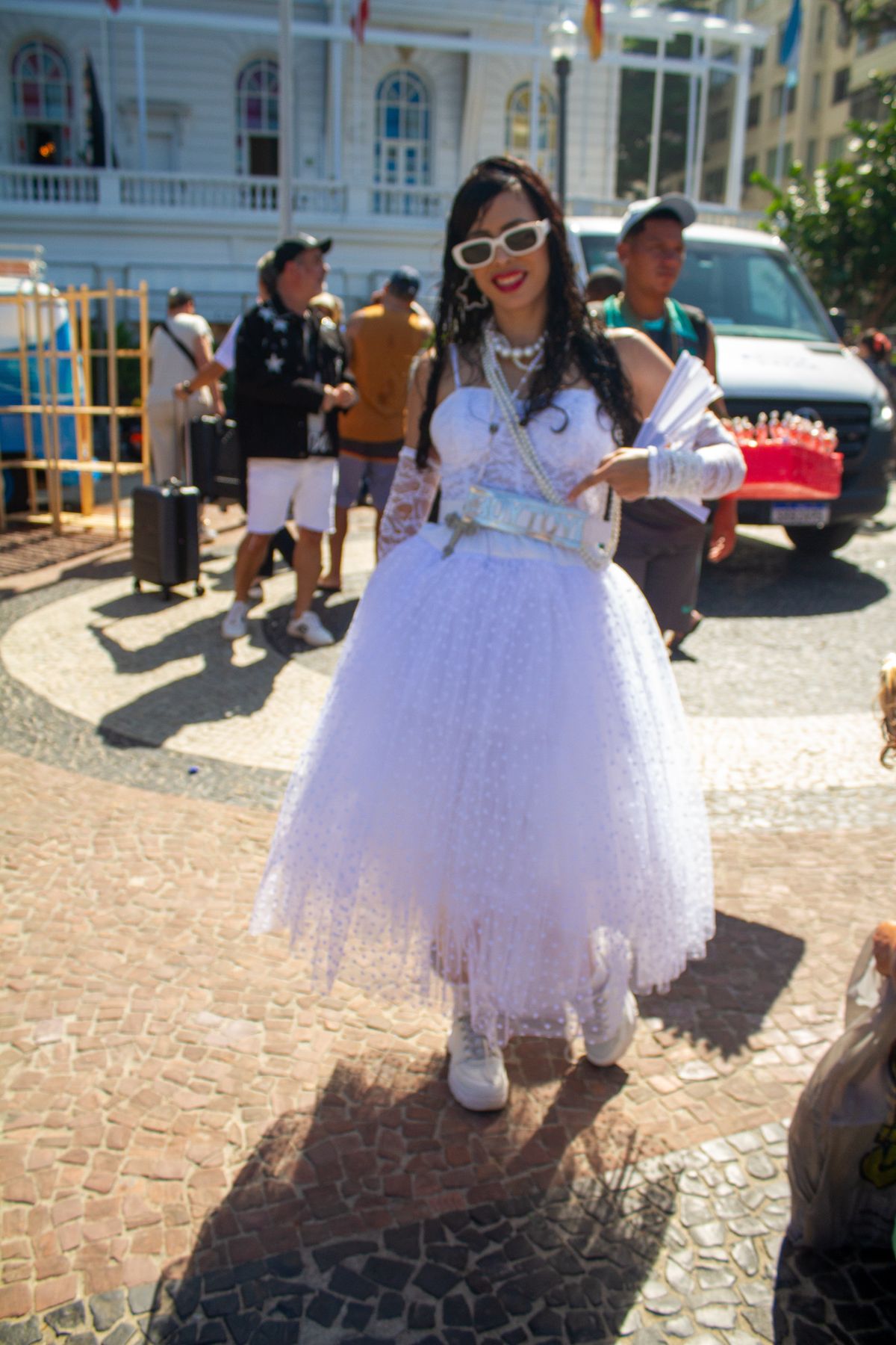 Ela conta que não se sentiu intimidada pelo calor: "Moro no Rio de Janeiro, estou acostumada com sol e carnaval. Hoje pra mim é como se fosse um Carnaval fora de época".>