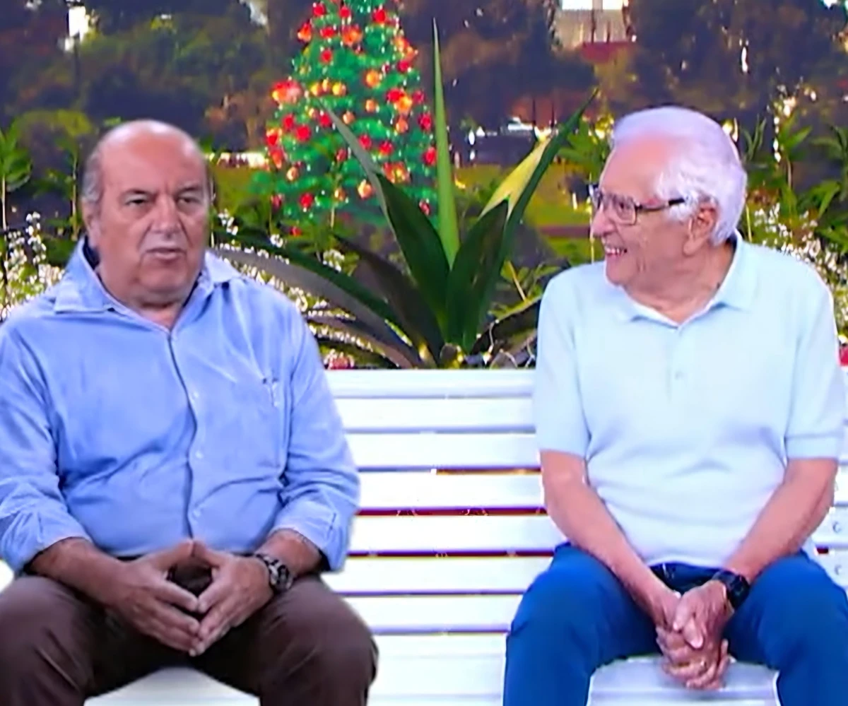 A interação também incluiu referências aos filhos de Carlos que trabalham no programa. "É um encontro de duas gerações, né, pai?", disse Carlos Alberto. "Três. Tem o Marcelo e o Beto", respondeu a representação por IA, em referência a filhos de Carlos Alberto.>