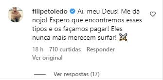 O brasileiro Felipe Toledo, o Felipinho, espera que o capixaba nunca mais volte às competições de surfe. "Ai, meu Deus! Me dá nojo! Espero que encontremos esses tipos e os façamos pagar! Eles nunca mais merecem surfar!", cobrou Filipe Toledo.>