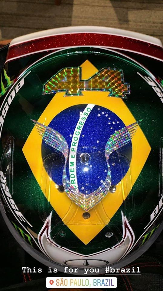 Fã declarado do eterno Ayrton Senna e apaixonado pelo Brasil, Hamilton vai correr com um capacete personalizado, que terá as cores verde e amarela no casco. Na entrevista, ele também falou de sua relação com Interlagos. Minhas primeiras memórias são de assistir Senna por aqui e de jogar no computador. Sempre começava a correr a temporada aqui. Eu jogava sempre com o Ayrton Senna. Eu amo Interlagos, eu acho que para os carros que nós temos atualmente parece um pouco pequena, eu gosto mais da versão mais longa do circuito. É uma honra poder dirigir nessa pista, declarou.>