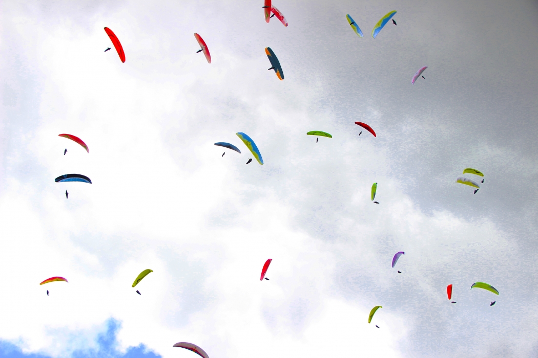 Com gliders coloridos, a competição muda a paisagem de Baixo Guandu. As duas cores mais comuns dos parapentes, porém, são exatamente as cores do céu e das nuvens: azul e branco. Coincidentemente, são seguidas daquelas presentes no arco-íris: amarelo, laranja, vermelho, roxo e verde. Menos escolhidas, na lanterna, aparecem o preto, o rosa, o cinza e o dourado.>