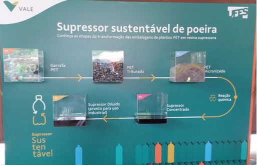 E, para reduzir o descarte de lixo no meio ambiente, e também contribuir para a redução da emissão de poluição industrial em Vitória, a Vale desenvolveu, em parceria com a Universidade Federal do Espírito Santo (Ufes), um produto feito de garrafa pet para ser usado como supressor de poeira, que vai substituir o produto usado hoje, feito à base de celulose ou glicerina. >
