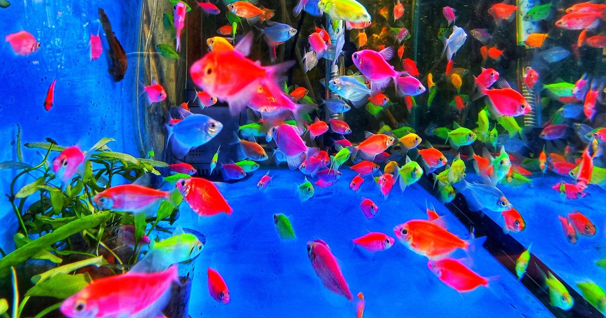 Esses peixes emitem fluorescência por meio da inserção de genes de anêmonas ou águas-vivas, o que lhes confere cores intensas e a capacidade de brilhar quando expostos à luz ultravioleta.>
