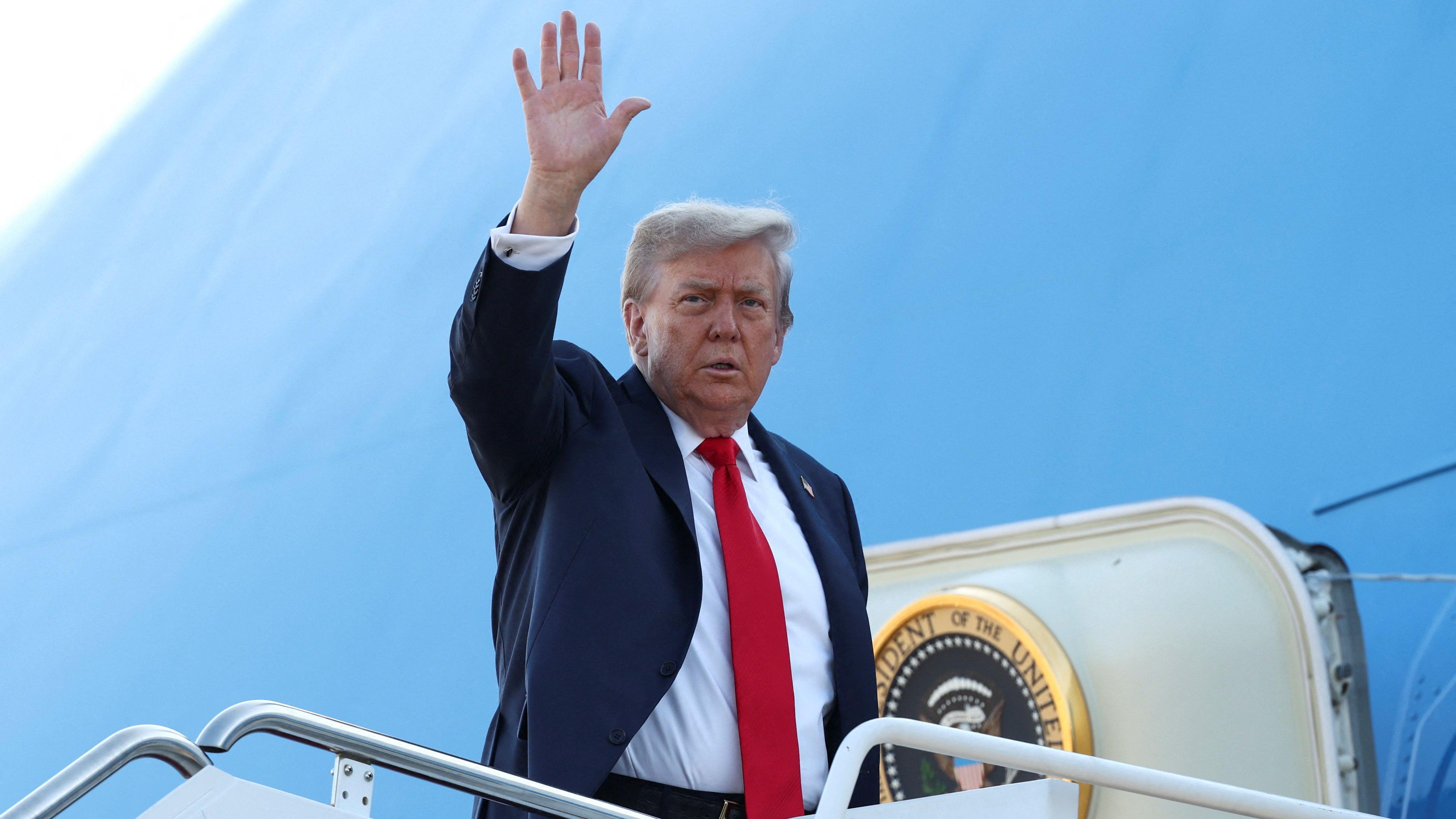 Trump deixou a Casa Branca por volta das 07h31 (horário local) em sua limusine presidencial, conhecida como The Beast, e embarcou no Air Force One, um Boeing 747-200B adaptado com suíte presidencial, escritório, academia, centro de comunicações, ala médica e capacidade para até 70 passageiros.>