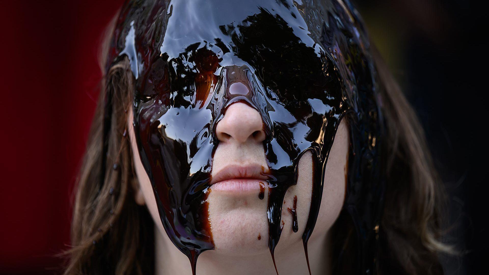 Com o rosto coberto por uma substância oleosa, uma ativista do grupo de ação direta Fossil Free London posicionou-se na frente dos escritórios da empresa de energia Shell, em maio.>