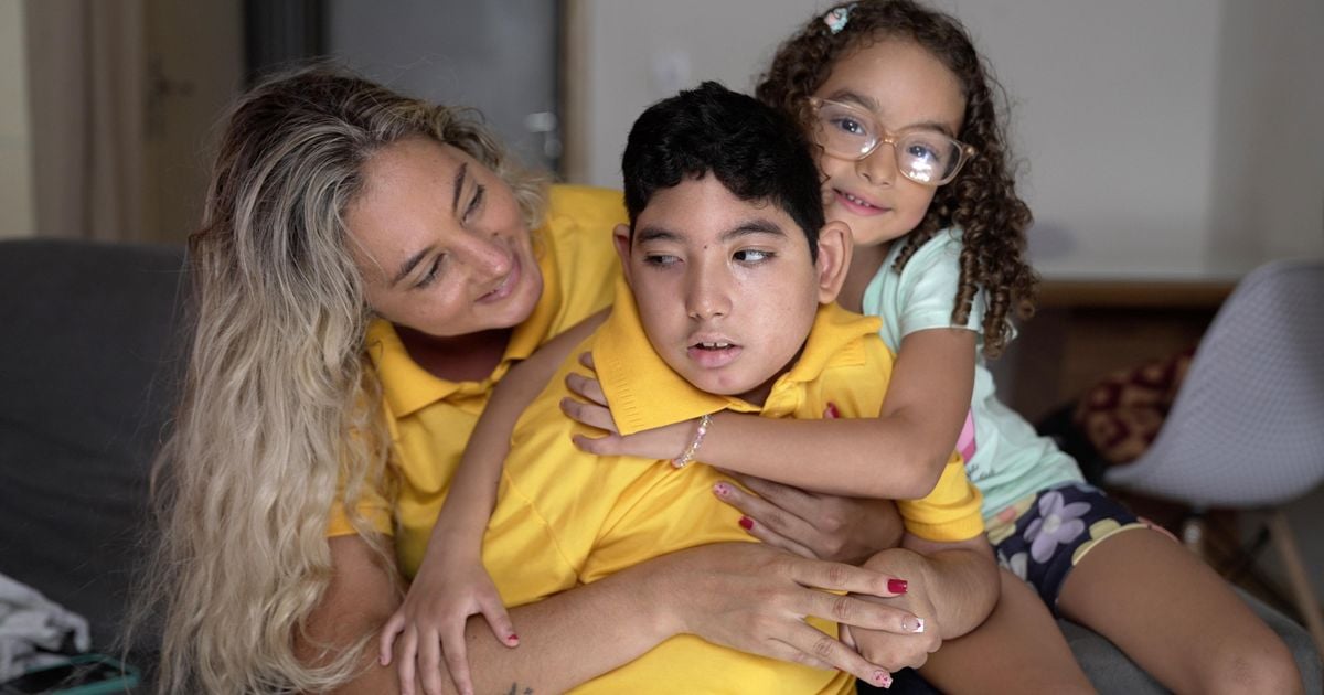 Anne Caroline Rosa ajeita o filho Moisés no colo e lhe dá um cheirinho no pescoço, enquanto sua mais nova, Maria, faz cafuné na cabeça do irmão.>