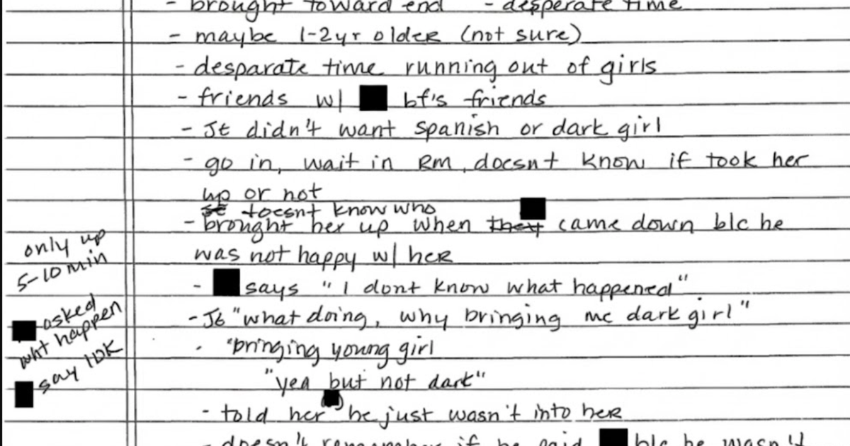 Segundo o documento do depoimento, uma pessoa que é citada como "JE" (possivelmente Jeffrey Epstein) teria imposto critérios sobre as meninas que lhe eram apresentadas, afirmando que não queria "spanish or dark girls" (pelo contexto, aparentemente referindo-se a latinas/hispânicas).>